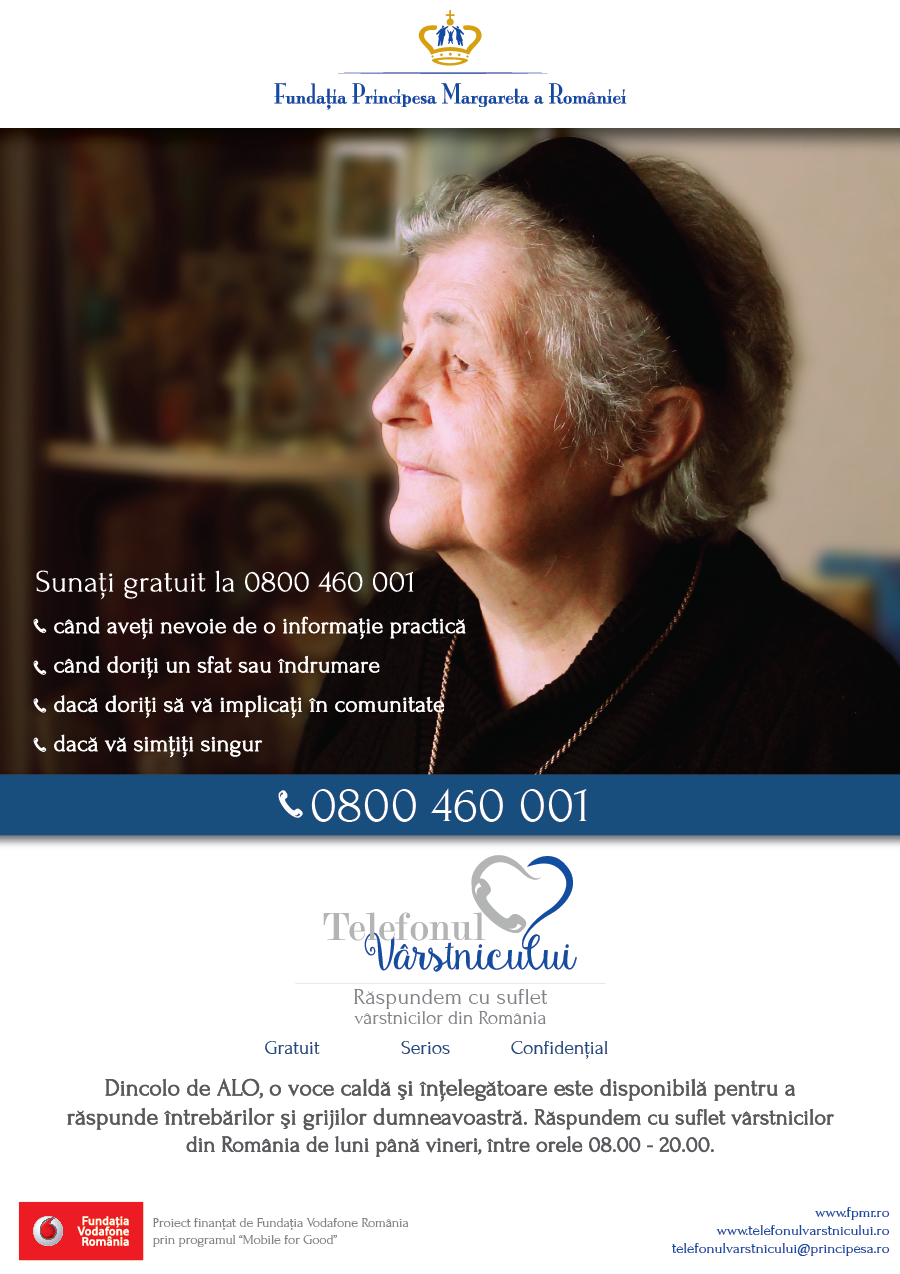 Bucureşti, 10 noiembrie 2015 – Fundaţia Principesa Margareta a României anunţă lansarea liniei Telefonul Vârstnicului – prima linie telefonică gratuită de ajutor şi consiliere dedicată vârstnicilor din România, proiect desfăşurat în parteneriat cu Fundaţia Vodafone România şi finanţat prin programul Mobile for Good cu suma de 68 500 Euro.