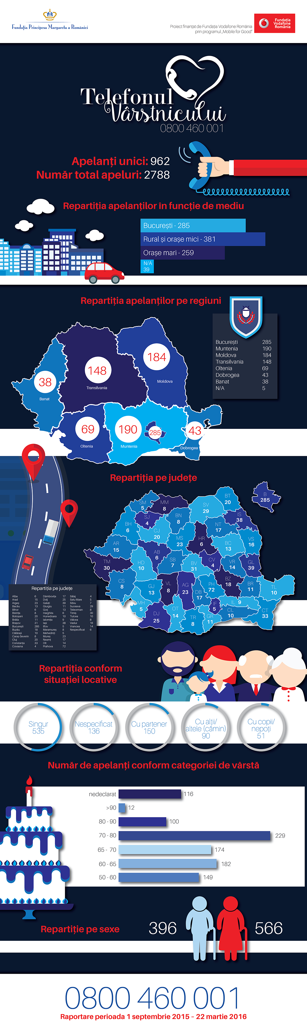 București, 5 aprilie 2016 – La șase luni de la lansare, Telefonul Vârstnicului, prima linie telefonică gratuită de informare și asistență dedicată persoanelor peste 65 de ani, operată de către Fundația Regală Margareta a României și finanțată de către Fundația Vodafone România prin programul „Mobile for Good”, a înregistrat peste 2.700 de apeluri, dintre care 962 sunt apelanți unici, proveniți din toate regiunile țării. Găsiți infografic aici.