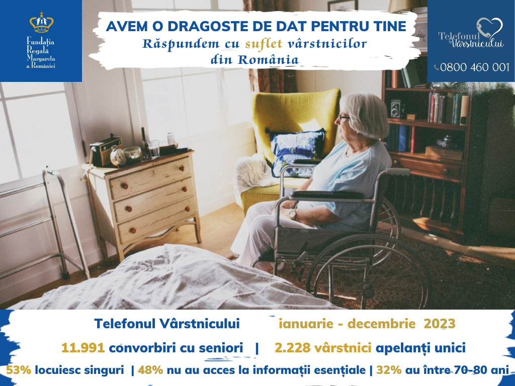 În 2023, serviciul social licențiat Telefonul Vârstnicului, singura linie telefonică națională gratuită dedicată seniorilor, operată de Fundația Regală Margareta a României, a înregistrat 11.991 de convorbiri telefonice cu vârstnici și aparținători din toată țara, care au beneficiat de informare, consiliere socială, îndrumare, sprijin material sau emoțional. 2.228 dintre apelanții seniori au sunat pentru prima dată, 46% dintre ei provin din mediul rural și din orașe mici, 48% solicită informații utile traiului de zi cu zi, 32% au între 70 și 80 de ani, iar 53% locuiesc singuri.